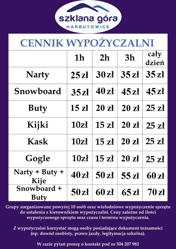 Stacja Narciarska Szklana Góra dysponuje własną wypożyczalnią sprzętu narciarskiego i snowboardowego w ramach której zajmujemy się kompleksową obsługą narciarzy i snowboardzistów. Posiadamy komplety nart i snowboardów renomowanych firm zawsze dobrze przygotowanych do jazdy przez nasz serwis narciarski na profesjonalnej maszynie do regeneracji ślizgów. Sprzęt jest dla zapewnienia Waszego bezpieczeństwa zawsze odpowiednio dobrany i fachowo wyregulowany. Wypożyczalnia zlokalizowana jest w budynku wypożyczalni poniżej stacji dolnej kolei linowej. U nas masz gwarancję, że dostaniesz buty zawsze suche i zdezynfekowane.